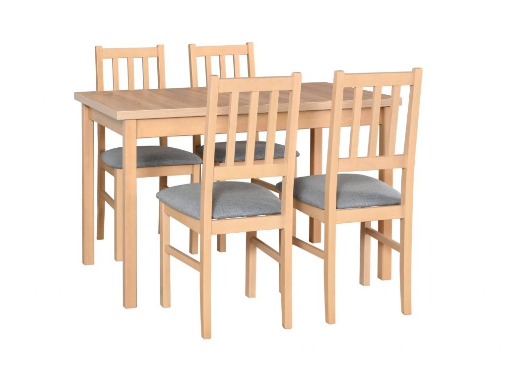 Jedálenský set sa skladá z jedálenského stola MAX 10 a 4 kusov jedálenských stoličiek BOS 4. Na obrázku je prevedenie Dub sonoma, poťahová látka 7 B.