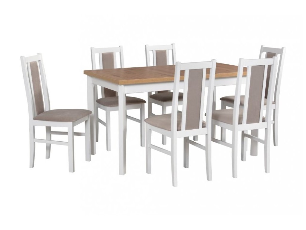 Vrchná časť jedálenského stola je vyrobená z kvalitnej laminovanej dosky v prevedení artisan. Podnož stola je vyrobená z bukového dreva vo farbe biela, je vysoko stabilná a odolný. Dodávané v demontovanom stave. Hmotnosť 35,2 kg.