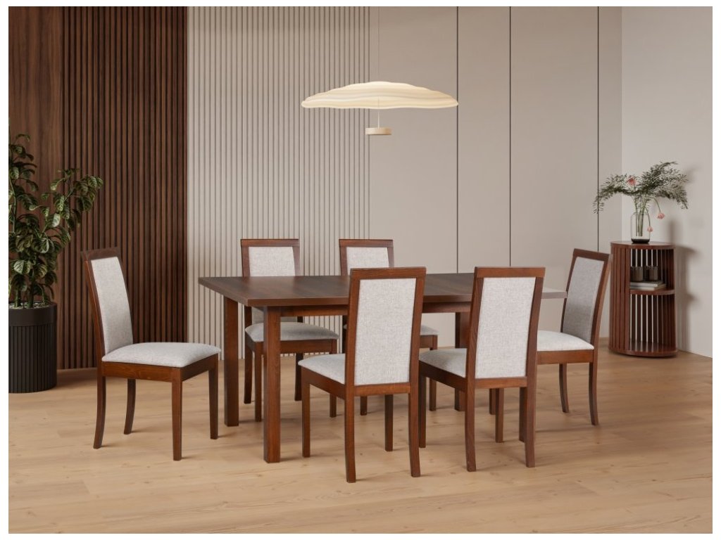 Jedálenská stolička Roma 4 je vyrobená z masívneho bukového dreva, čalúnená kvalitnou látkou podľa Vášho výberu. Stačí sa raz posadiť na túto stoličku, plnú neuveriteľnej grácie a triedy, aby ste vedeli, že to je ono. Stôl Modena 2 je vyrobený z bukového dreva, jedálenská doska je vyrobená z lamina opatrená ABS hranou. Konštrukcia stola je založená na vysokých nohách, ktoré zaisťujú stabilitu. V prípade potreby je možné rozložiť do dĺžky až 200 cm. Rozkladanie jedálenského stola je prakticky riešené vložením medzikusu do jeho stredovej časti, po odsunutí bočných častí. Stoličky sú dodávané kompletné, pri stole je potrebné spojiť hornú dosku s nohami. Váha celej zostavy je 80 kg.