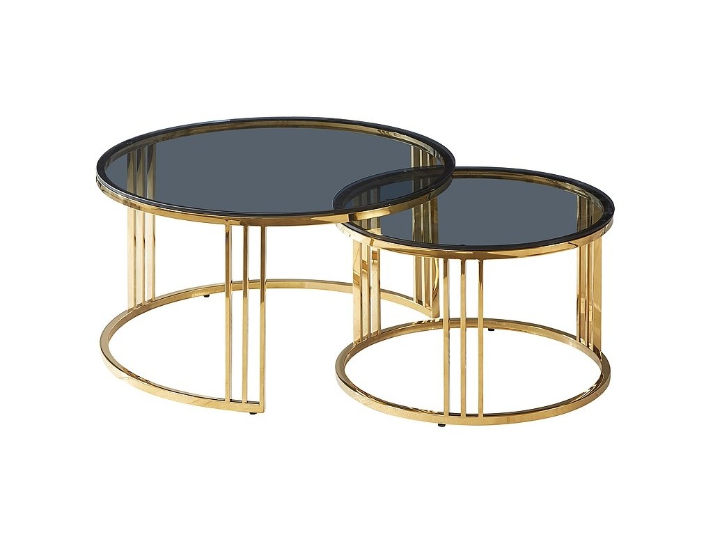 Sada stolíkov, vrchná časť: tvrdené dymové sklo, rám: kov, farba: strieborná. Rozmery menšieho stolíka: fi 60, v-40cm.