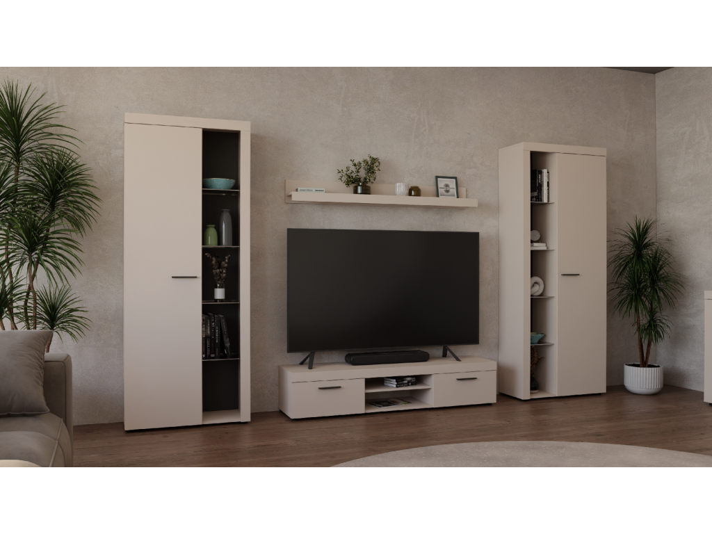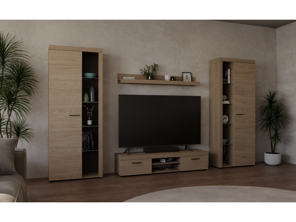 Obývacia stena RUMBA XL je vyrobená z pevného a zároveň ľahkého materiálu. Pre pravidelné čistenie postačí prachovka alebo vlhká handra. Komplet pozostáva z niekoľkých prvkov. Úložný priestor tvoria dve presklené skrine po bokoch zostavy, RTV skrinka s dvomi policami a úložným priestorom chránený dvierkami. V obývacej stene je aj polica. Dvierka aj zásuvky obsahujú úchyty, ktoré majú podlhovastý tvar. Zostava je zhotovená vo farebnej kombinácií biela, dub sonoma, dub lefkas, biela/ jasný betón a grafit/ dub lefkas. Celková hmotnosť obývacej steny je 117,5 kg. Obývacia stena RUMBA XL je k dispozícii aj s LED osvetlením za príplatok. K obývacej stene je možné dokúpiť aj komodu RUMBA.