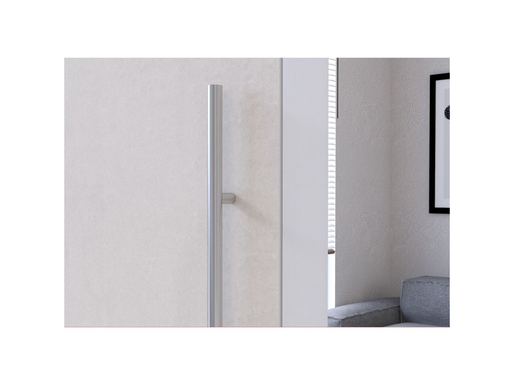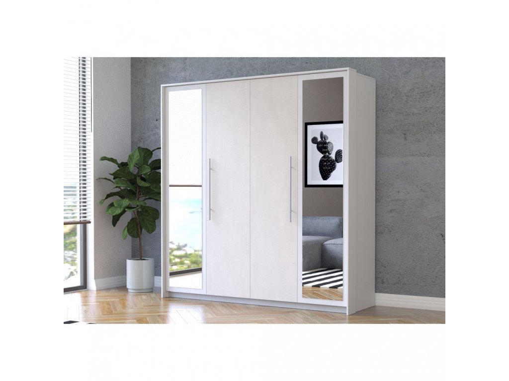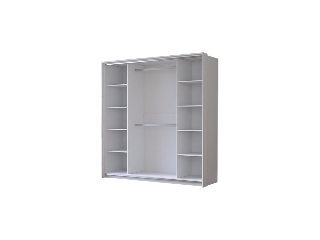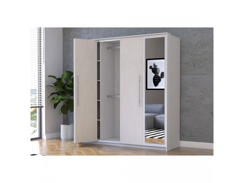 Skriňa má moderný dizajn a je vyrobená z pevného no zároveň ľahkého materiálu. Tento materiál sa jednoducho udržiava v čistote. Farebné prevedenie tejto skrine je silk/ biela. Dvere sa otvárajú posúvaním. Na posuvných dverách sa nachádzajú dve vysoké zrkadlá. Skriňa obsahuje praktické ABS hrany. V skrini sa nachádza po oboch bokoch praktická policová časť a dve vešiakové tyče v strede, čo ponúka dostatok úložného priestoru.
