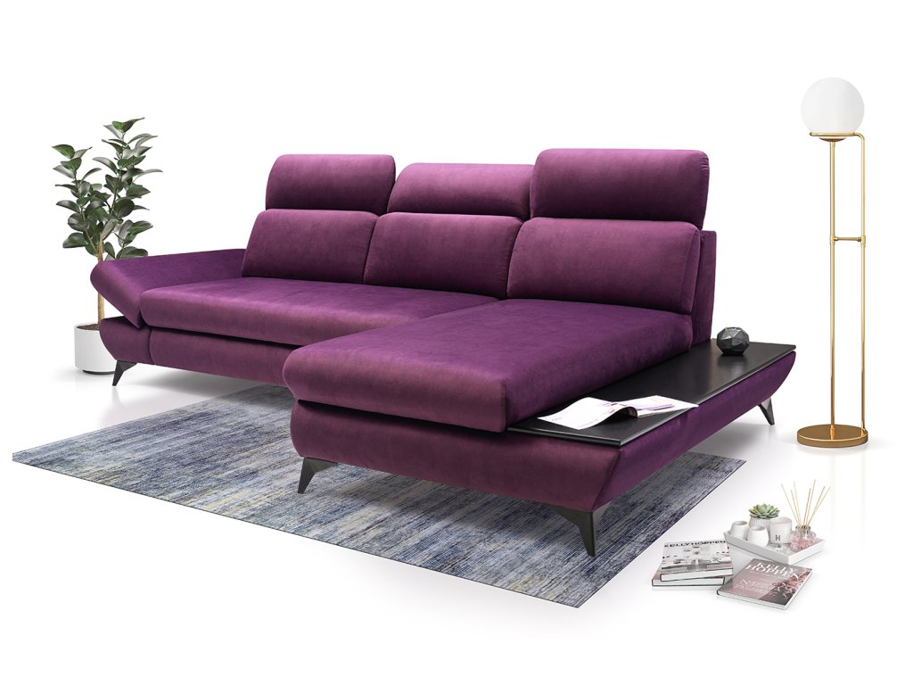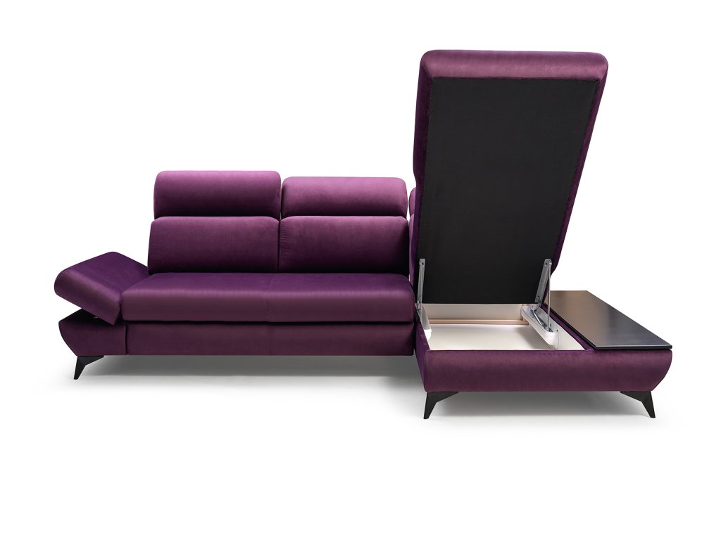 Moderná rohová rozkladacia sedacia súprava. Sedacia súprava Titan je vrátané veľkého úložného priestoru, polohovateľných opierok hlavy, polohovateľnej podrúčky a praktickej drevenej poličky pozdlž celého otomanu.