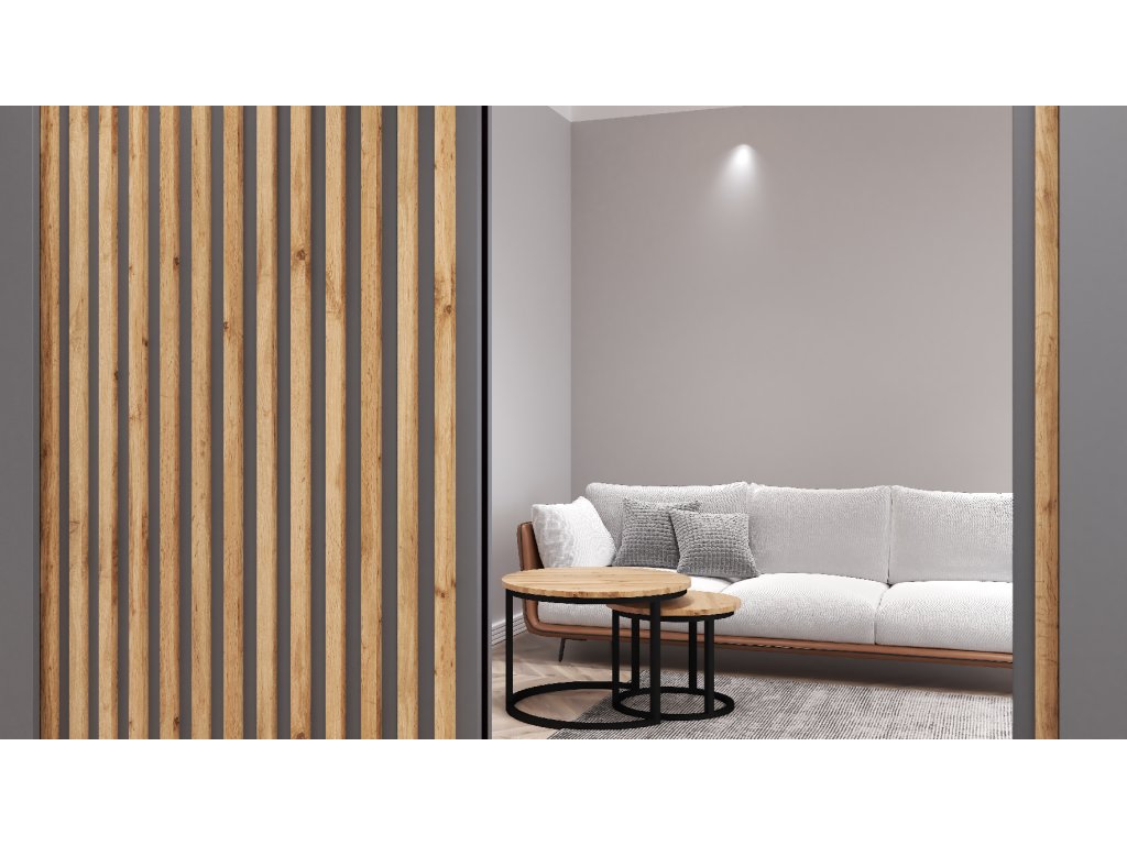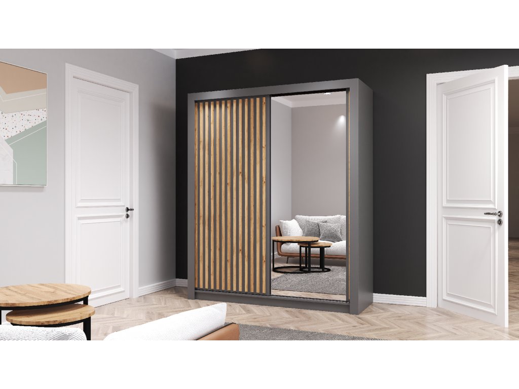 - MODERNÝ DIZAJN - Šatníková skriňa s posuvnými dverami so zrkadlom a lištami zaujme svojím minimalistickým, moderným vzhľadom.
